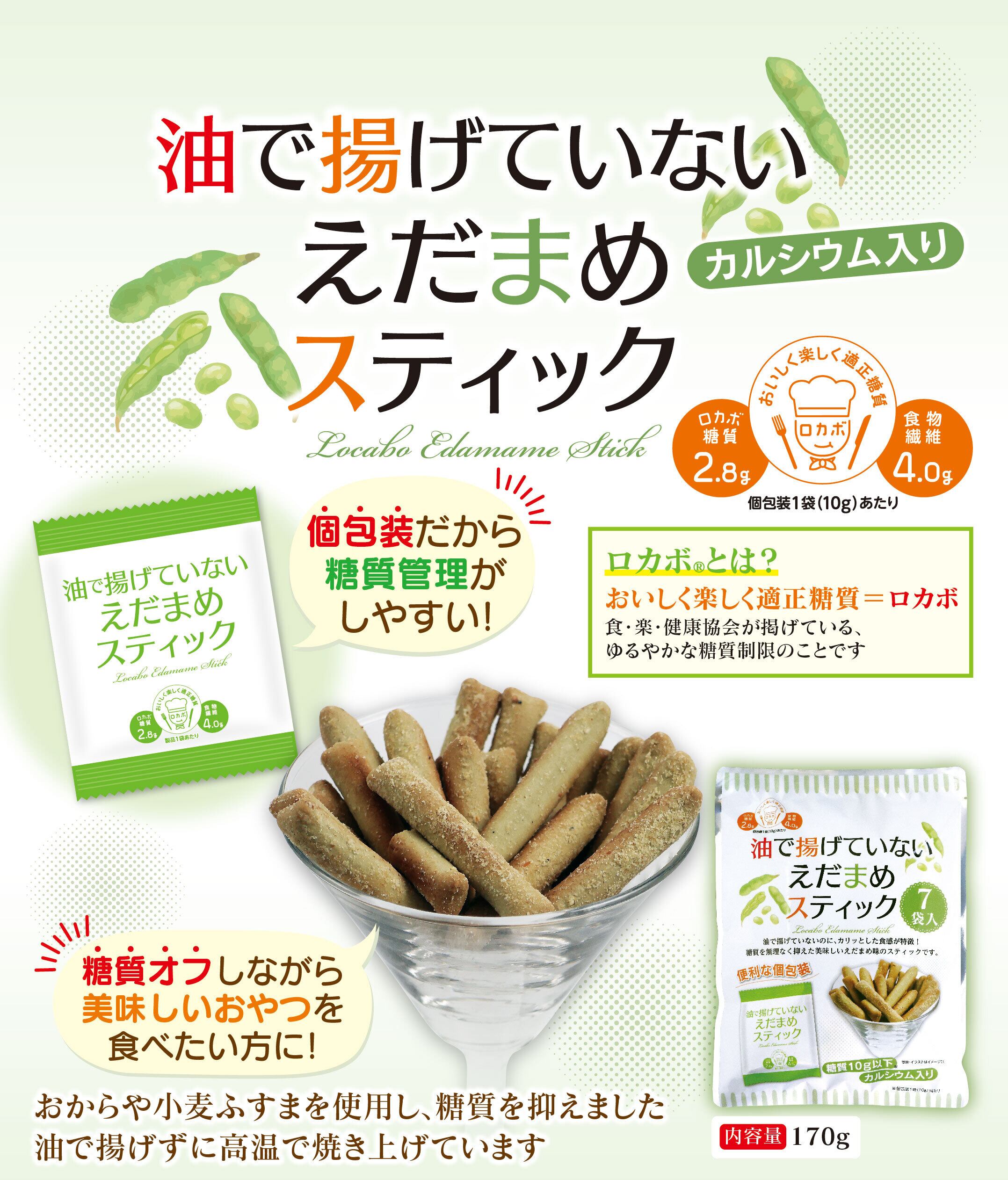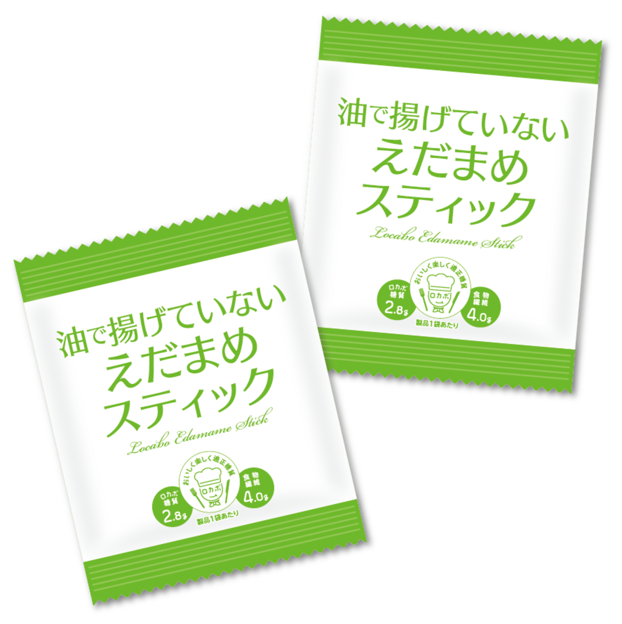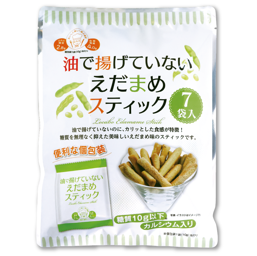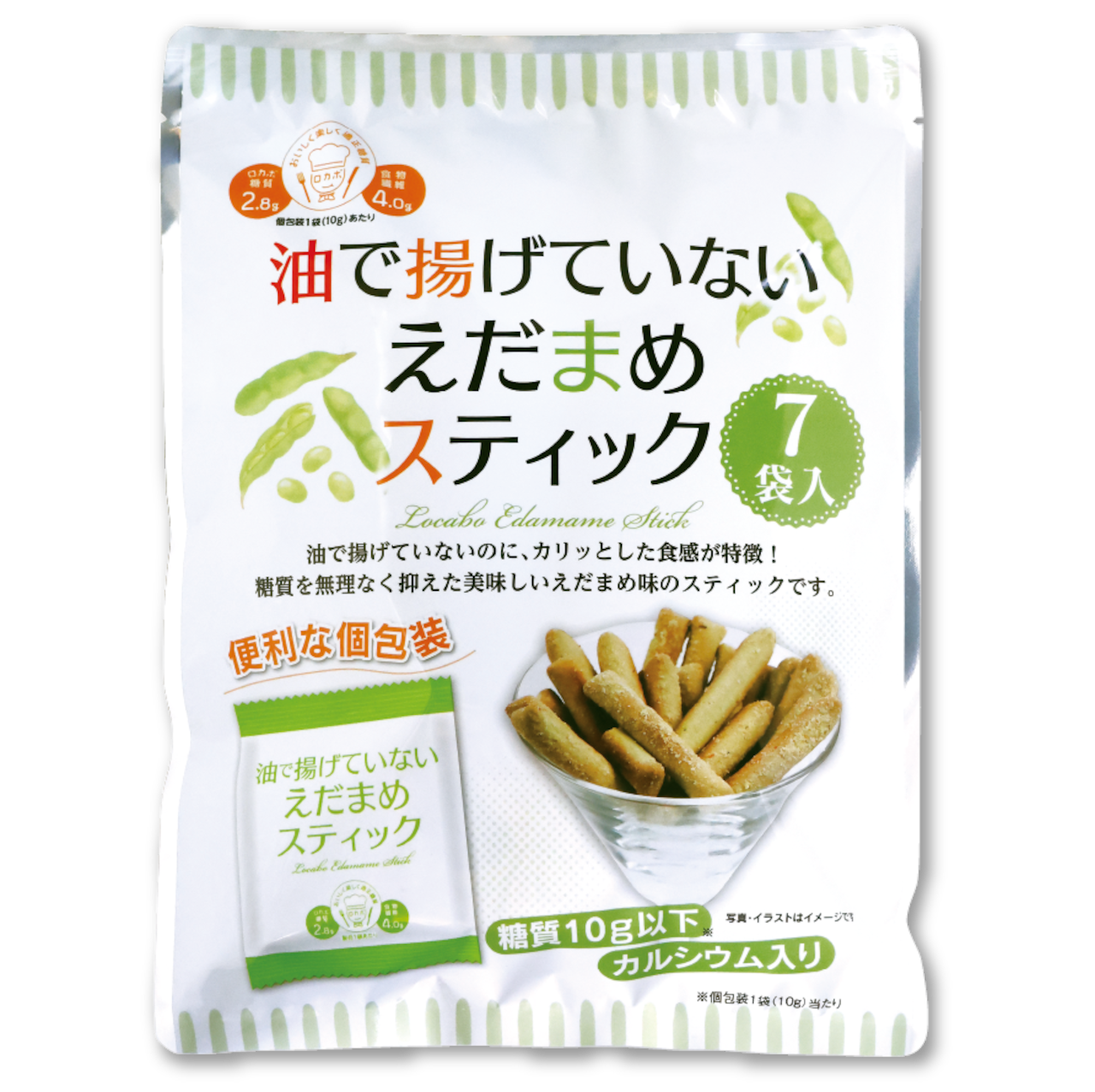 油で揚げていないのに、サクッと軽い食感が特徴!糖質を無理なく抑えた美味しいえだまめ味のスティックです。おからや小麦ふすまを使用し、糖質を抑えました 油で揚げずに高温で焼き上げています。