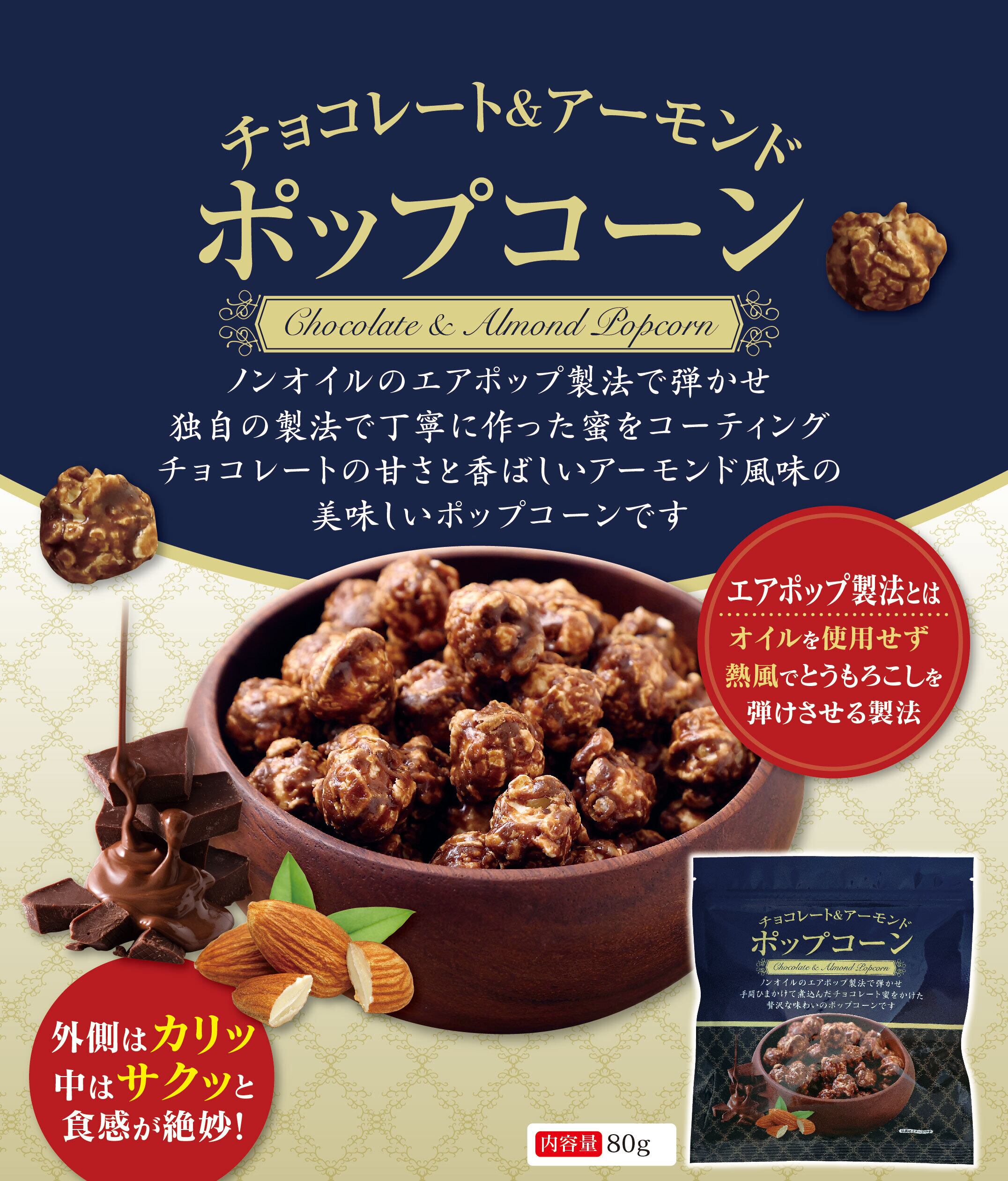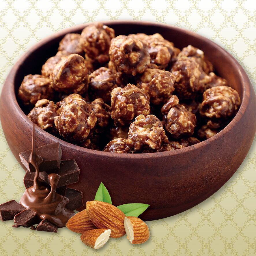 ノンオイルのエアポップ製法で弾かせ、独自の製法で丁寧に作った蜜をコーティング。チョコレートの甘さと香ばしいアーモンド風味の美味しいポップコーンです。