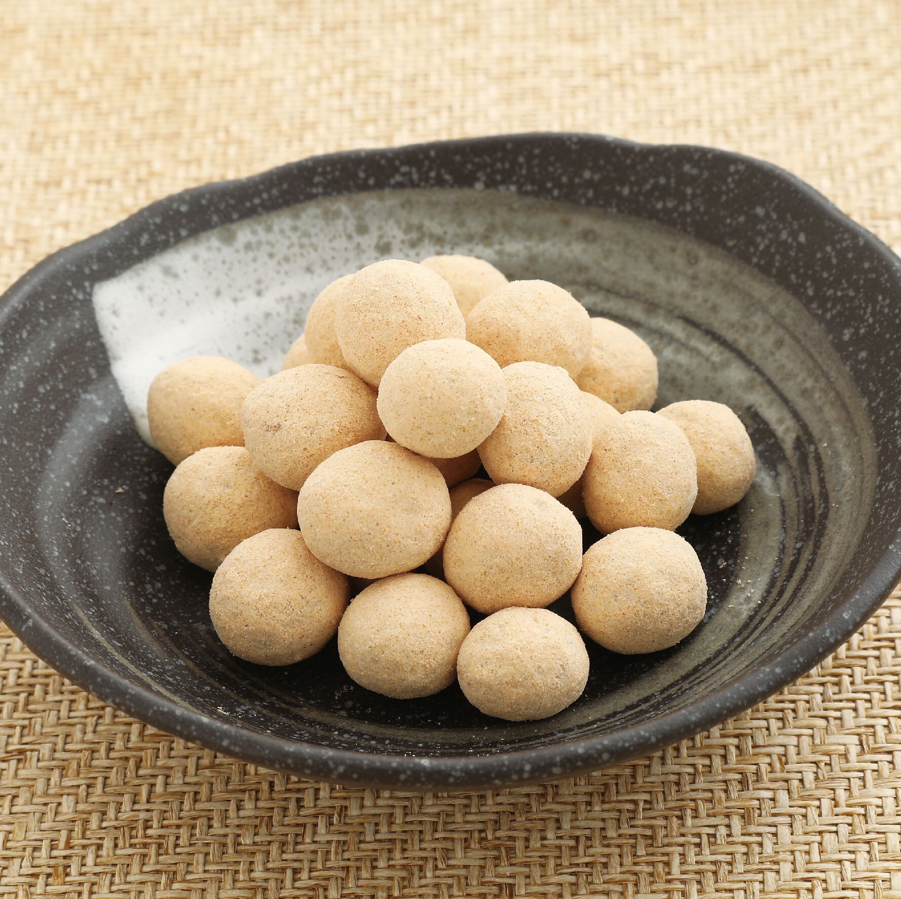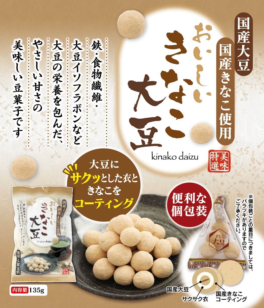 鉄・食物繊維・大豆イソフラボンなど大豆の栄養を包んだ、やさしい甘さの美味しい豆菓子です。