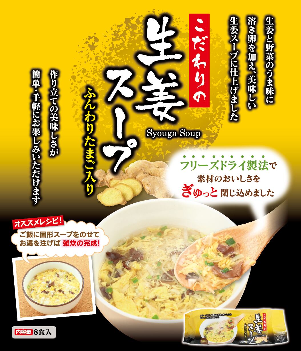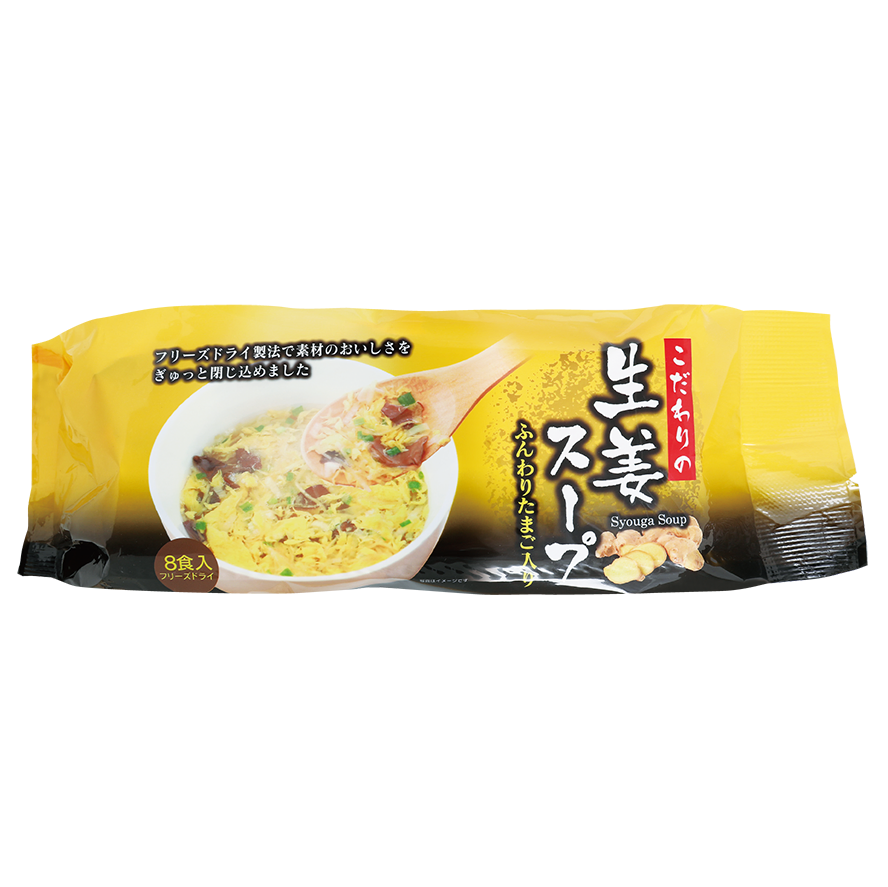 生姜と野菜のうま味に溶き卵を加え、美味しい生姜スープに仕上げました。作り立ての美味しさが 簡単・手軽にお楽しみいただけます。