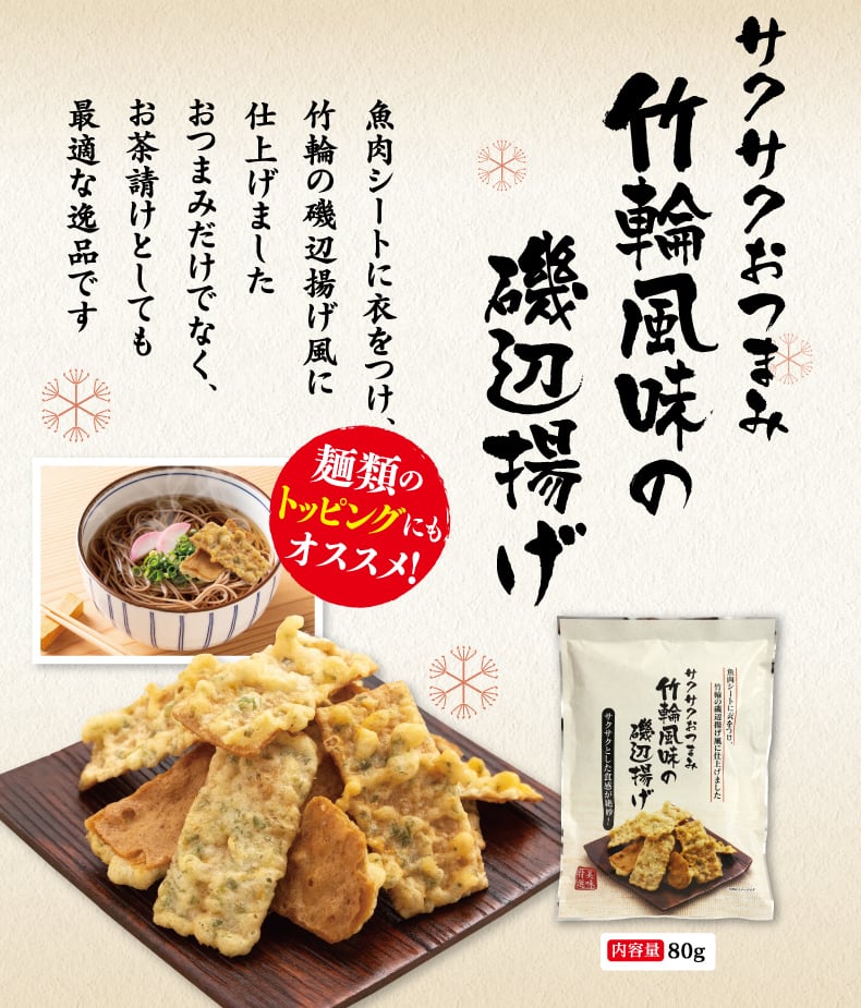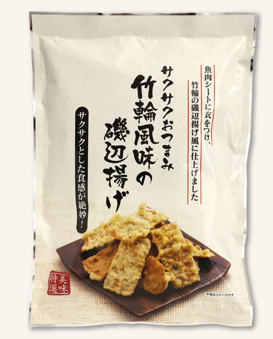 魚肉シートに衣をつけ、竹輪の磯辺揚げ風に仕上げました。おつまみだけでなく、お茶請けとしても最適な逸品です。
