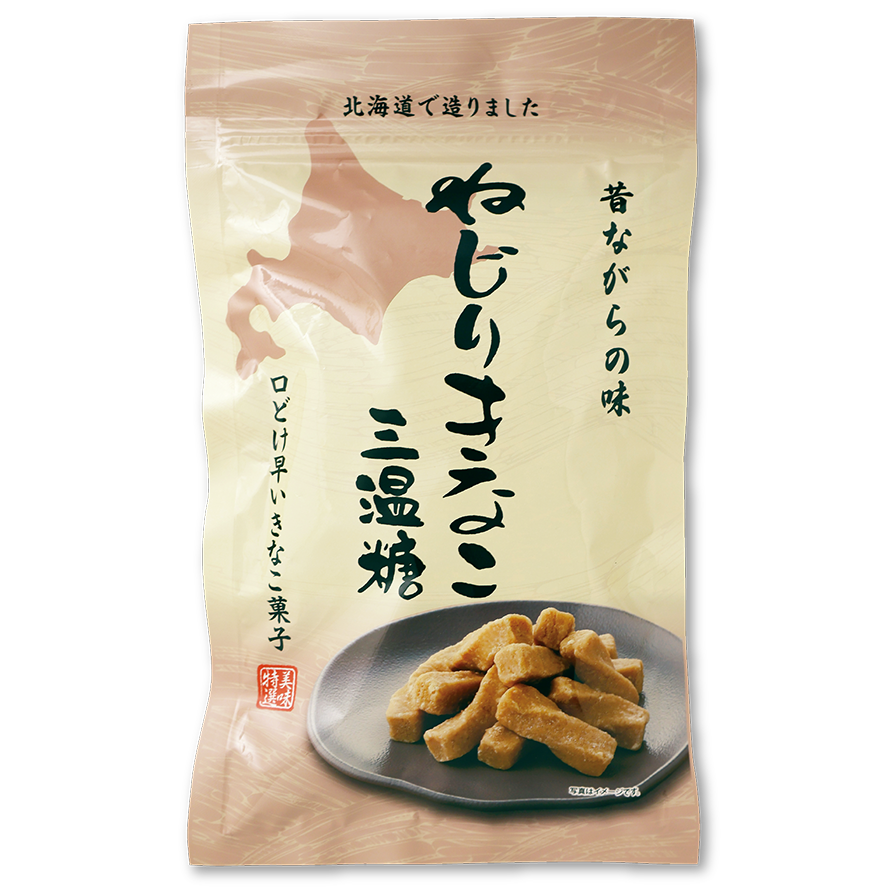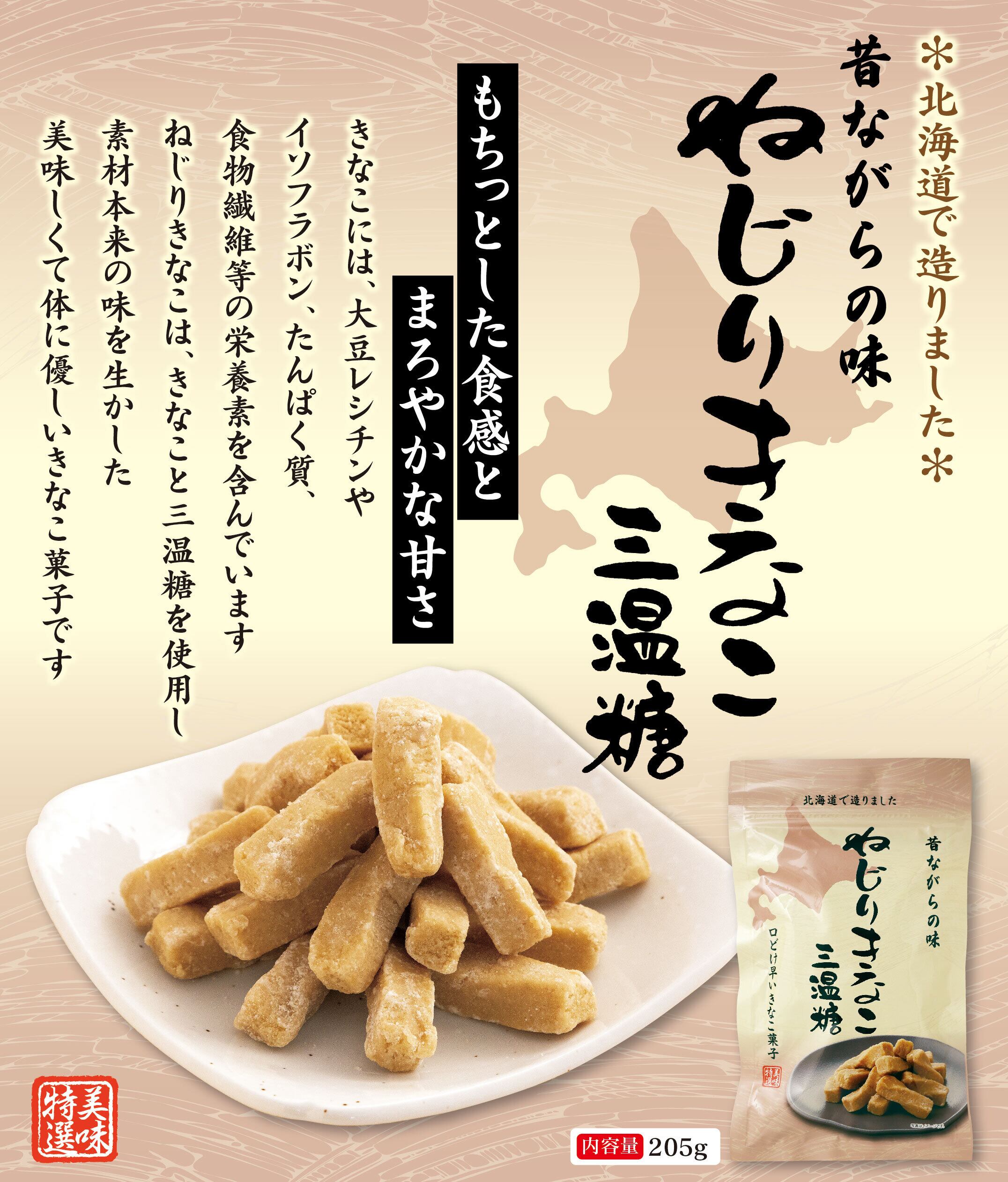 きなこには、大豆レシチンやイソフラボン、たんぱく質、食物繊維等の栄養素を含んでいます。ねじりきなこは、きなこと三温糖を使用し素材本来の味を生かした美味しくて体に優しいきなこ菓子です。